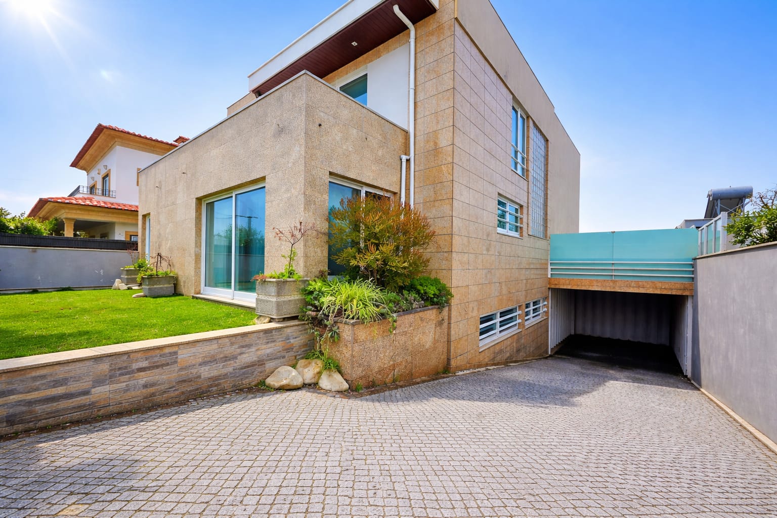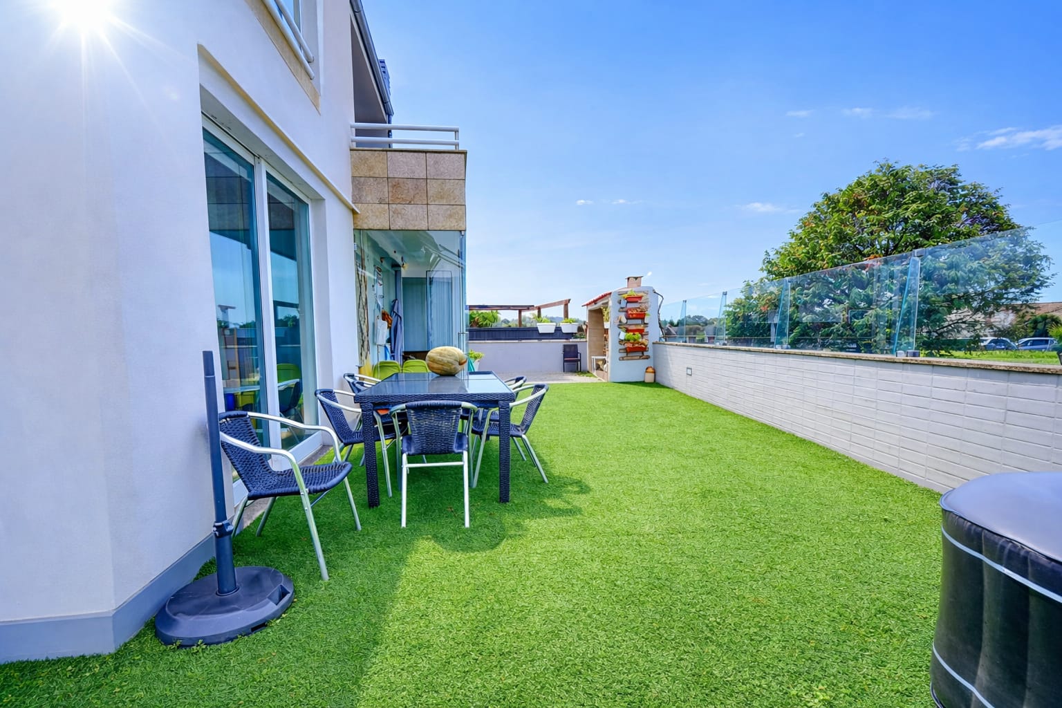 No exterior, existem zonas verdes com relva sintética na frente e nas traseiras, havendo ainda lugar a uma zona de churrasco com forno a lenha.